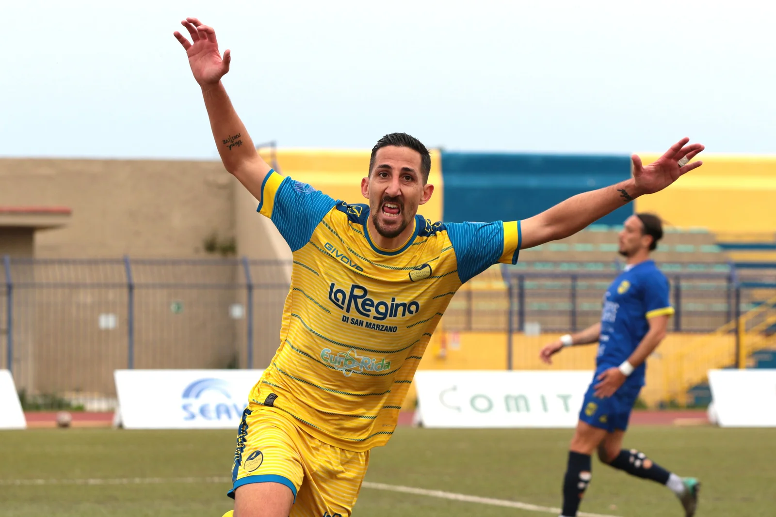 13’ vantaggio della Scafatese. Azione insistita dei canarini con Santarpia a sinistra, la manovra coinvolge tutti gli attaccanti gialloblu in campo fino al sopraggiungere di Vacca che, dal limite, indovina l’angolino lontano e fa 1-0